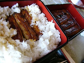 先ず二段のお重の上の段はもちろんてりっと輝く鰻!