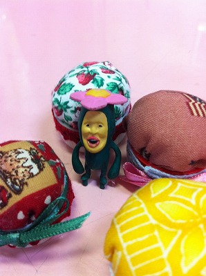 ペットボトルのキャップで作った針刺しにもたれかかってる