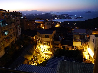 夕闇せまる遠くに海、提灯がやがてにぎにぎしく輝きだす